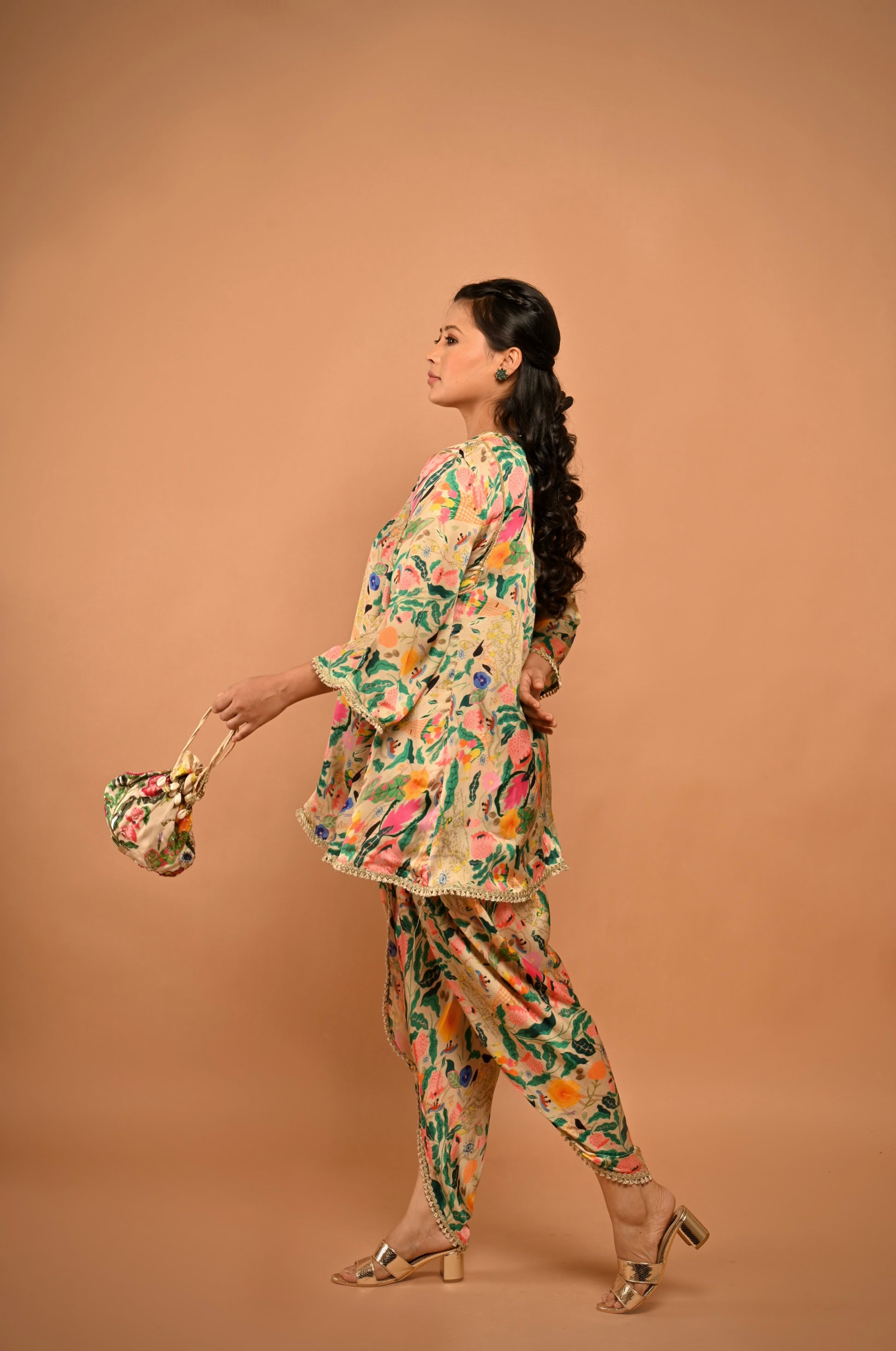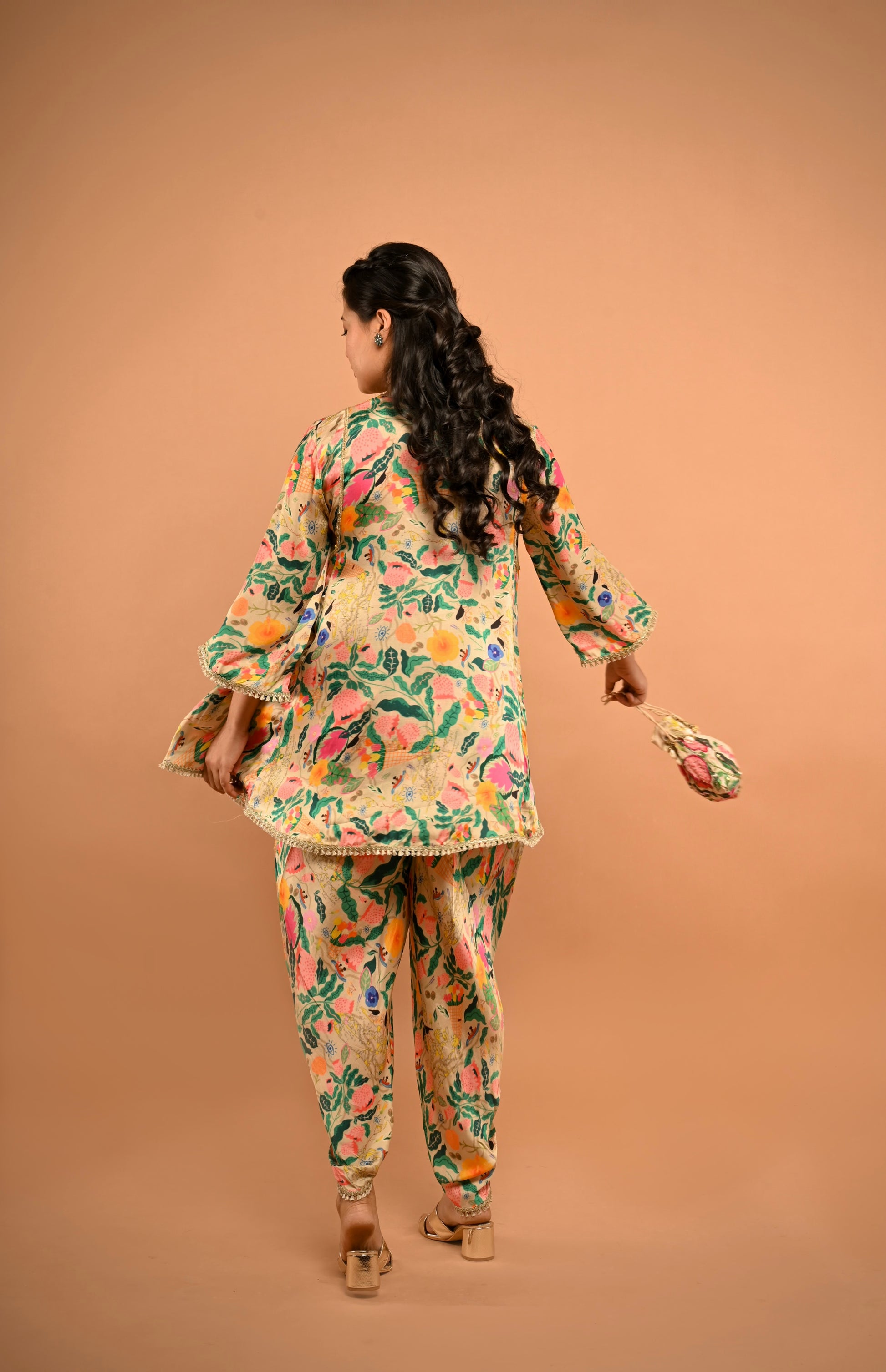 Get our best-selling print in this Kurta Set with hand embellished potli.