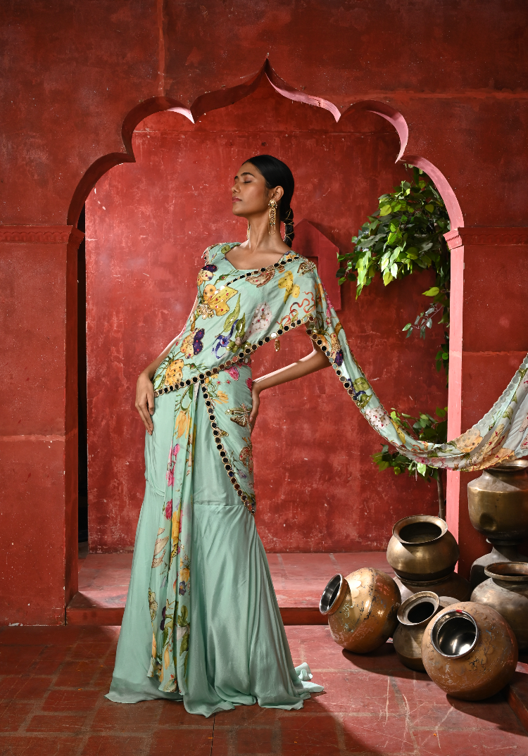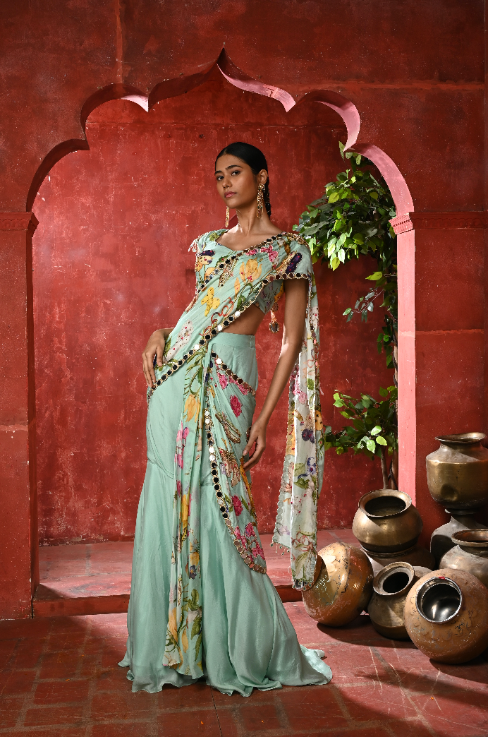 A seafoam pre-draped saree crafted with a sculpted fishcut skirt for a fluid, elongated silhouette. Paired with an intricately hand-embroidered blouse and pallu, finished with mirrorwork border detailing, it’s a striking choice for modern celebratory events.